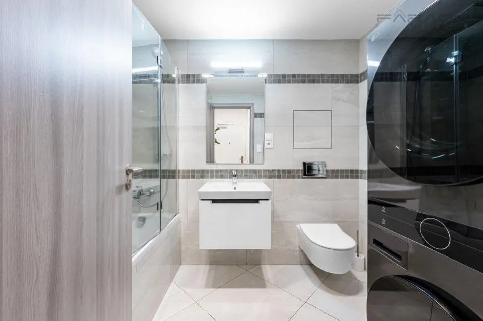 Kompletní vybavení zahrnuje kuchyňskou linku s vestavěnými elektrospotřebiči (indukční varná deska, trouba, myčka, digestoř, lednice s mrazákem), jídelní stůl se čtyřmi designovými židlemi, rozkládací sofa, televizní skříňku s televizí, teplovodní podlahové topení v koupelně, plastová okna s izolačními trojskly, předokenní venkovní žaluzie s elektrickým ovládáním, vinylovou podlahu v dekoru světlého dřeva, dlažbu v předsíni a koupelně a bezpečnostní vchodové dveře s bezpečnostním zámkem. V ložnici je manželská postel a šatní skříň. Součástí vybavení je také pračka se sušičkou.