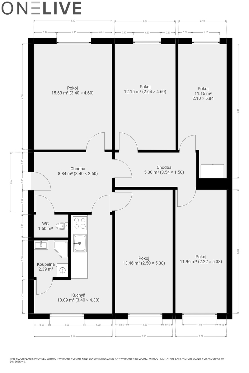 Dispoziční řešení bytu nabízí vysokou míru praktičnosti: ze vstupní předsíně je přístup do kuchyně, dvou samostatných pokojů a na oddělené WC. Dále byt disponuje koupelnou se sprchovým koutem a třemi dalšími neprůchozími pokoji.
