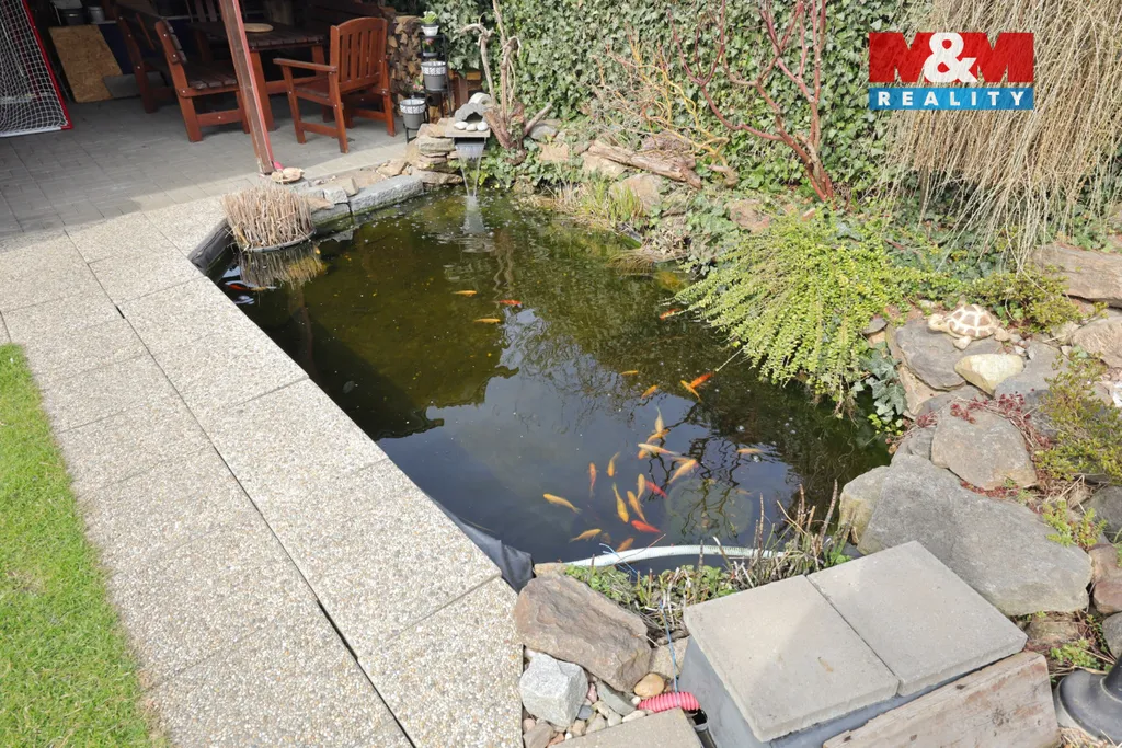 Součástí domu je ideální zahrada, která nabízí dostatek prostoru pro odpočinek, rodinné aktivity i zahradničení. Skutečnou dominantou exteriéru je pak vymazlené jezírko, které dodává celému prostoru jedinečný charakter a vytváří příjemnou oázu klidu.