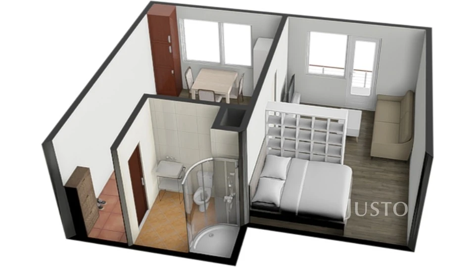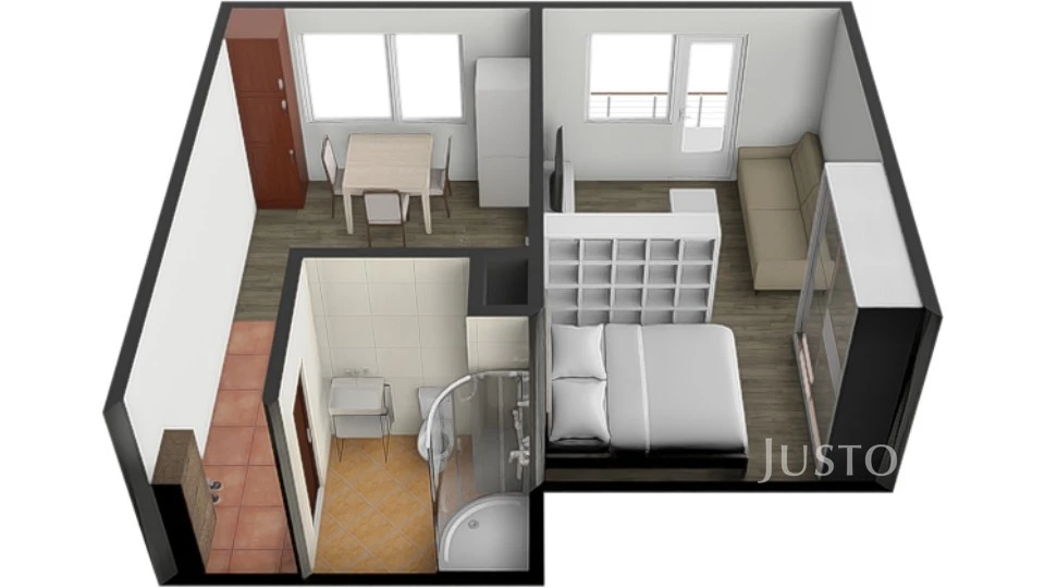 Byt je umístěn v prvním patře panelového domu s výtahem a je částečně vybaven. Ze vstupní chodby vedou dveře vlevo do koupelny s WC a sprchovým koutem. Naproti vstupu je kuchyně vybavená kuchyňskou linkou, která je průchozí do světlého pokoje. Z pokoje je přímý vstup na jižně orientovaný balkon, odkud je příjemný výhled do okolí a dostatek denního světla po celý den. K bytu náleží sklep o ploše 1 m², který poskytuje další úložný prostor.