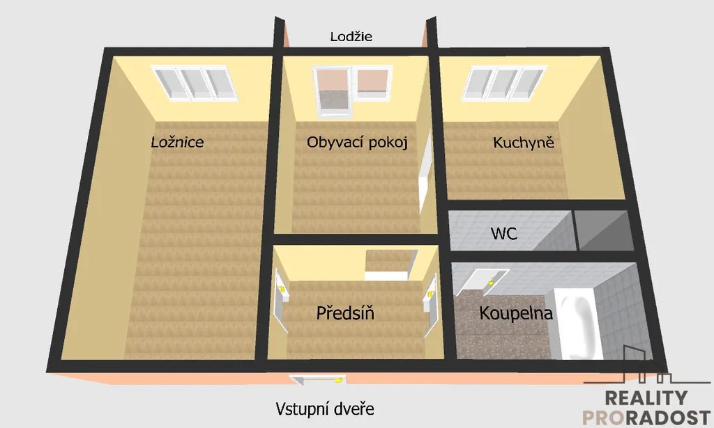 Dispozice bytu je promyšlená a zahrnuje vstupní chodbu, prostornou ložnici a obývací pokoj s přímým vstupem na lodžii. Dále je zde plně vybavená kuchyň, koupelna a samostatné WC pro maximální pohodlí. K dispozici jsou moderní spotřebiče včetně elektrické trouby, plynové varné desky, mikrovlnné trouby, lednice, myčky nádobí a pračky, což usnadní každodenní život. Pro zajištění soukromí a regulace světla jsou v oknech namontovány vnitřní žaluzie.