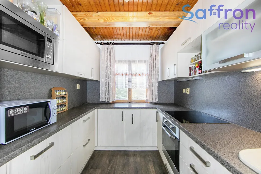 V přízemí se nachází obývací pokoj, jehož dominantou jsou krb a kamna, které společně vytvářejí hřejivou atmosféru a příjemné zázemí pro chvíle odpočinku. Dále je k dispozici samostatná kuchyně, koupelna a praktické úložné prostory.