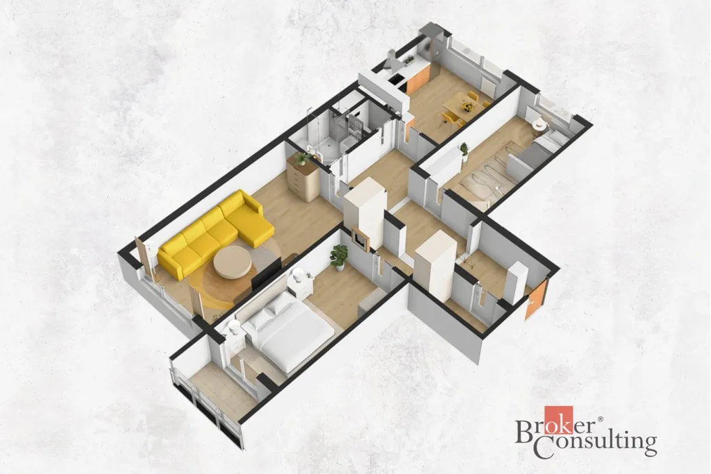 Dominantou bytu je světlý obývací pokoj o velikosti 20 m², ideální pro společné chvíle s rodinou i návštěvy. Samostatná kuchyně nabízí dostatek prostoru pro pohodlné vaření i stolování. Dva další pokoje lze flexibilně využít jako ložnici, dětský pokoj nebo pracovnu, což Vám umožní přizpůsobit byt Vašim aktuálním potřebám.