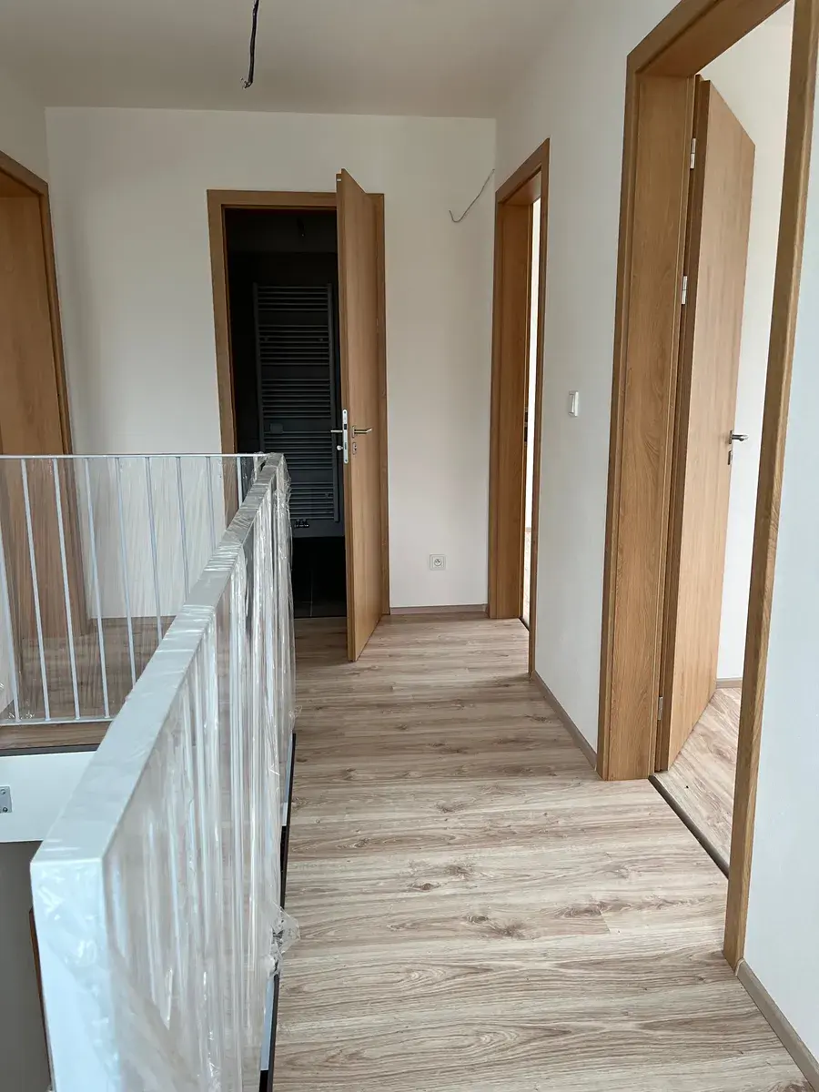 Vnitřní dveře jsou otevíravé hladké dodávka SAPELI s CPL laminátem dekor buk. Mezi chodbou a obývacím pokojem jsou osazeny posuvné dveře do stavebního pouzdra, dtto mezi ložnicí a šatnou. Všechny dveře jsou obložkové.