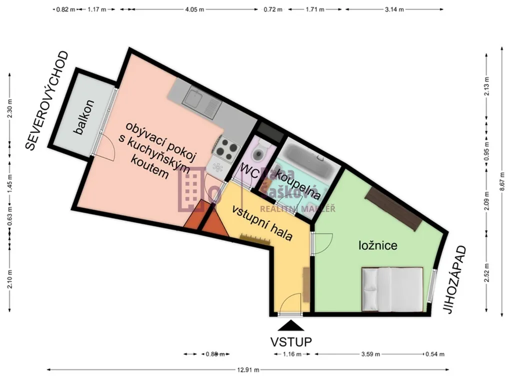 Částečně vybavený byt nabízí prostornou vstupní halu, koupelnu s vanou, samostatnou toaletu, obývací pokoj s kuchyňským koutem a ložnici.