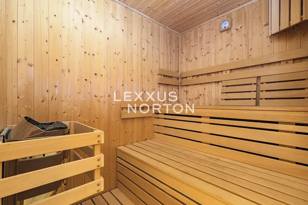Vila se nabízí nezařízená, přičemž její součástí je plně vybavený kuchyňský kout se spotřebiči: sporák, trouba, lednice, mrazák, myčka nádobí a mikrovlnná trouba. Byt dále disponuje vestavěnými skříněmi, alarmem, plynovým kotlem, domácím vrátným, pračkou, sušičkou a zahradním domkem. Podlahy tvoří kombinace plovoucí laminátové podlahy a dlažby.