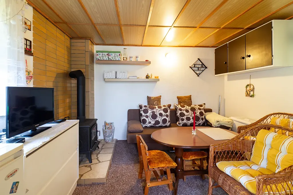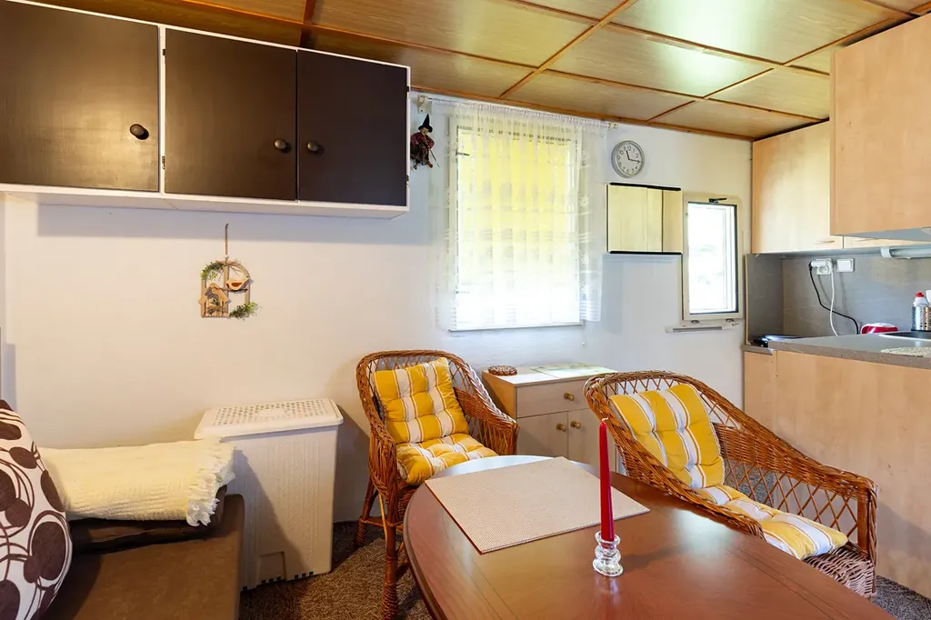 Chata je částečně podsklepená a nabízí praktické dispoziční řešení. V přízemí se nachází útulný obývací pokoj propojený s kuchyňským koutem, kde snadno vytvoříte příjemné zázemí pro rodinu či přátele. V podkroví je menší ložnice.