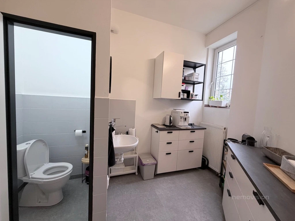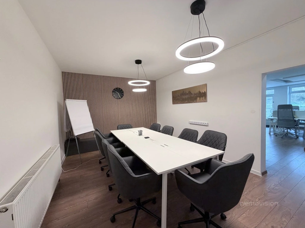 Velké okno v hlavní místnosti zajišťuje dostatek přirozeného světla a příjemnou atmosféru po celý den. Neutrální a čistý design umožňuje snadné přizpůsobení prostoru dle vašich potřeb a firemní identity.