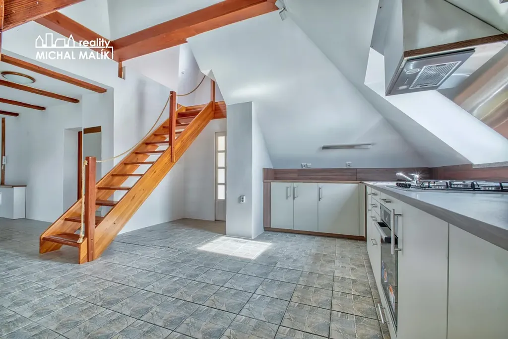 Dominantou bytu je velký otevřený prostor obývacího pokoje s kuchyňským koutem, který působí vzdušně a nabízí dostatek místa pro každodenní život i odpočinek. Z tohoto prostoru je přístup na samostatné WC a zároveň odtud vedou dřevěné schody do horní části bytu, která může sloužit jako ložnice, pracovna nebo relaxační zóna.