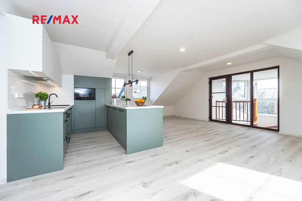 Kompletně a nově zrekonstruovaná jednotka se nachází v 2.NP rodinného domu a sestává se z velkého obývacího pokoje s kuchyňským koutem ( cca 45m2), který je vybaven chladničkou, mrazničkou, elektrickou varnou deskou, troubou, myčkou a digestoří a mikrovlnnou troubou. Všechny spotřebiče jsou vestavné a zcela nové. Ložnice měří cca 16m2 m2, dále je v bytě šatna (komora) a koupelna se sprchovým koutem, WC, umyvadlem s úložnými skříňkami a přípojkou na pračku. Prostor pod schodištěm vedoucím do bytu možno využít např. pro kolo, lyže atp.