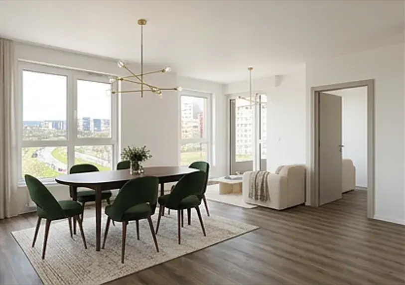 Interiér je dokončen v moderním standardu s důrazem na nadčasový design – kvalitní podlahy a velkoformátová dlažba vytvářejí čistý a elegantní základ, který si nový majitel může snadno dotvořit podle vlastního stylu. Byt je připraven na instalaci kuchyňské linky.