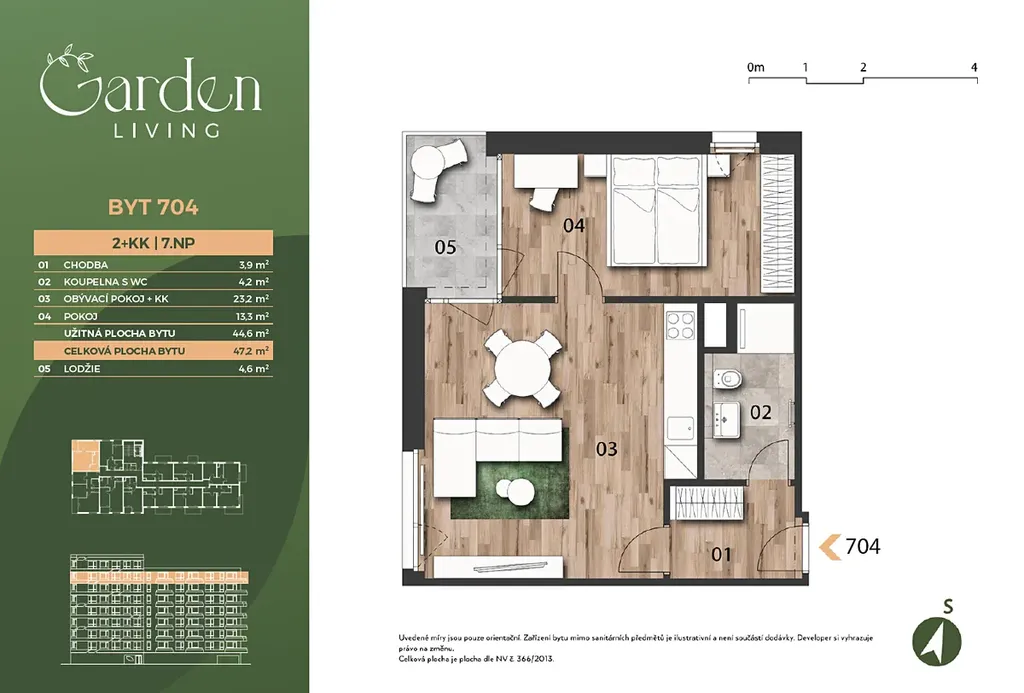 Byt působí velmi světlým a vzdušným dojmem díky velkým oknům a otevřenému prostoru. Dispozice je navržena s důrazem na praktičnost i komfort – vstupní chodba s místem pro úložné řešení, koupelna s WC, prostorný obývací pokoj s kuchyňským koutem (23,2 m²) a samostatná ložnice (13,3 m²), která nabízí dostatek soukromí.