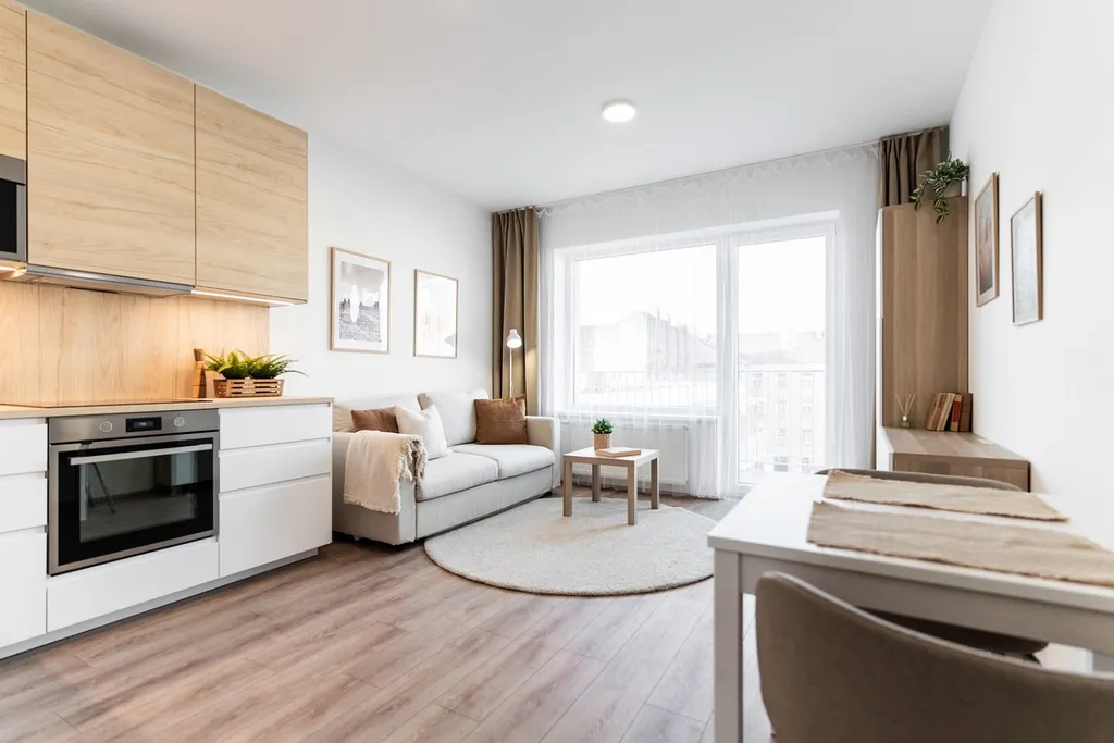 Dispozice bytu je praktická a účelná. Obývací pokoj s kuchyňským koutem je vybaven kuchyňskou linkou se spotřebiči (lednice s mrazákem, myčka, indukce, pečící trouba, mikrovlnka, digestoř). Prostor je příjemně prosvětlený a navazuje na balkon orientovaný do klidného vnitrobloku.