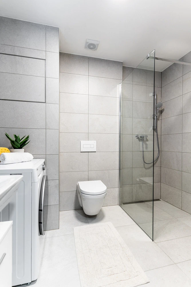 Koupelna je řešena v minimalistickém stylu s prostorným sprchovým koutem, závěsným WC a pračkou se sušičkou. Vše je nové, ve vysokém standardu a bez nutnosti dalších investic.