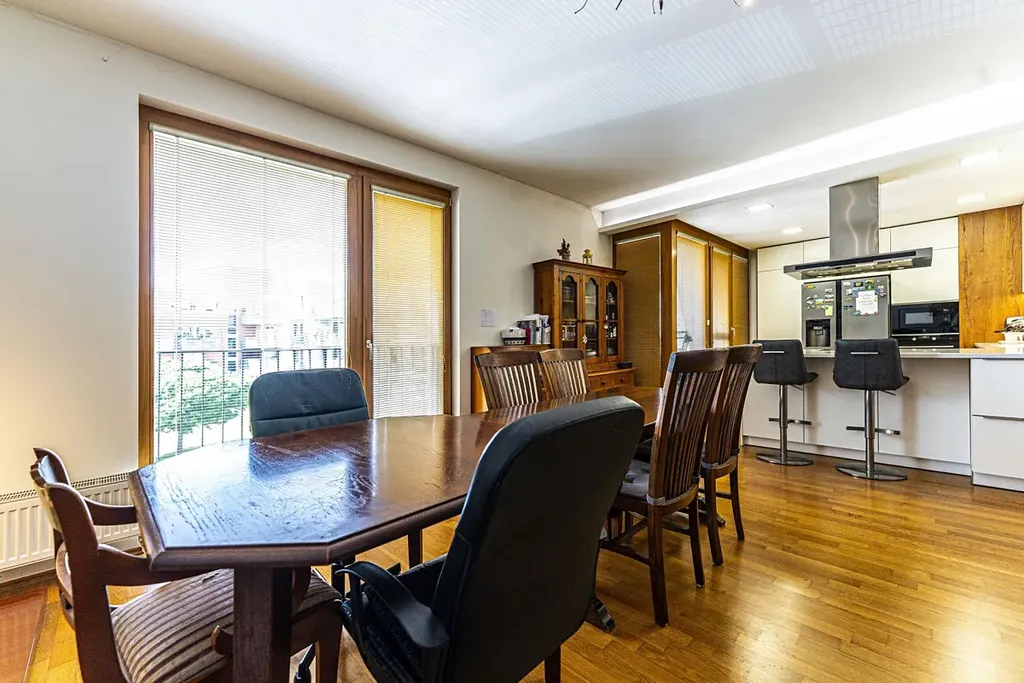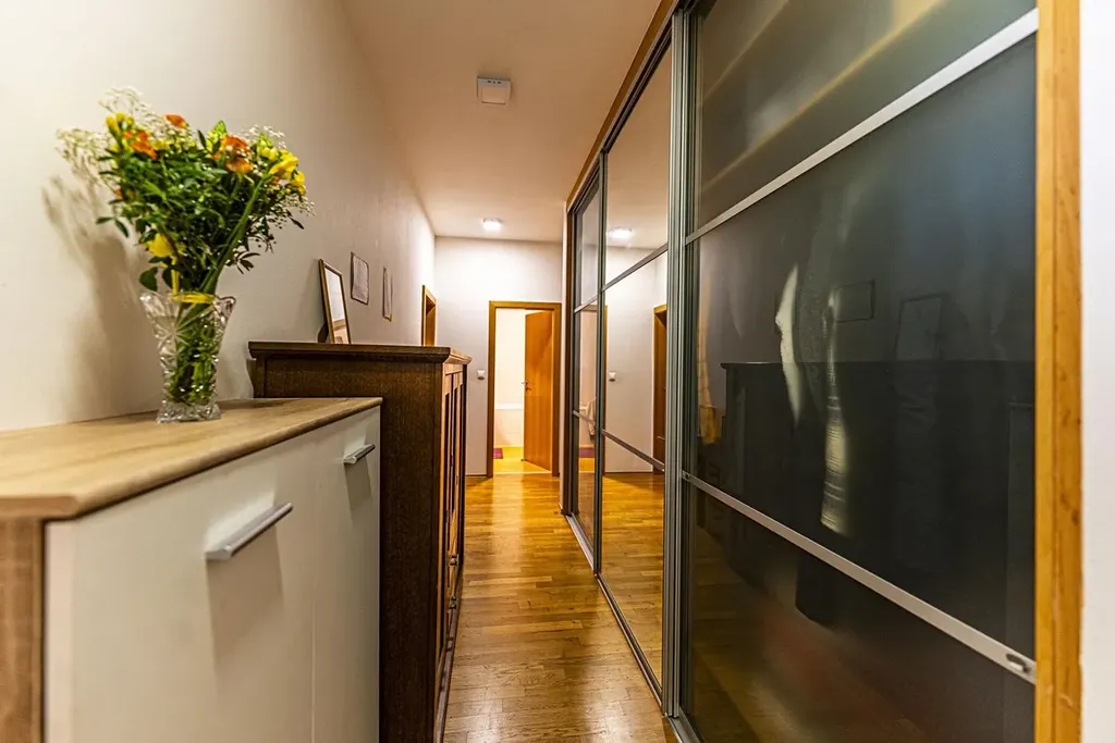 Dispozice: chodba (13,8 m2) s množstvím vestavěných úložných prostor, velký obývací pokoj s plně vybaveným kuchyňským koutem (37,5 m2), 3 ložnice (jedna s šatnou. Velikost ložnic: 18,8 m2, 14,2 m2 a 11,6 m2), 2 koupelny (5,5 m2 a 4 m2), lodžie (6,9 m2).