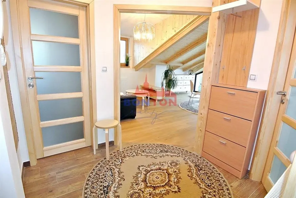 Ve výhradním zastoupení nabízíme česky nebo slovensky mluvícím zájemcům pronájem krásného slunného atypického podkrovního bytu 3+kk, orientovaného na jih s nádherným výhledem do zahrady i na oboru s ovečkami, a situovaného v podkroví rodinného domu ve vyhledávané lokalitě Prahy 4 Šeberov. Byt o obytné ploše 58 m2 má vlastní vchod, veškeré IS a je nadstandardně vybavený. Dispozice: malá hala (4,46 m2) se samostatnými vstupy do ložnice (11,01 m2), do pokoje (14,2 m2), do koupelny (5,98 m2) a do obývacího pokoje s kuchyňským koutem (21,72 m2). Z vybavení: dřevěné dubové podlahy (olejovosk) a dlažby, dveře z borovicového masivu, dřevěná sklopně výklopná střešní okna ROTO s roletkami, protisluneční fólie na oknech v ložnici, kuchyňská linka s kombinovanou lednicí s mrazákem, vest. el. troubou, indukční varnou deskou, myčkou, výsuvnou digestoří, mikrovlnnou troubou aj., sedačka, dva designové konferenční stolky z ohýbané břízy, komoda a TV stolek masiv, stůl (sklo, nerez) se 4 židlemi (ohýbané dřevo, nerez), kompletně zařízená ložnice s vest. zrcadlovou skříní, manželskou postelí s úložným prostorem, skříňky, úložný prostor v šikmině o ploše 6 m2, velká atypická eurookna s obousměrnými žaluziemi bambus plisé (v ostatních oknech jsou žaluzie v dekoru dřeva), pokoj je vybaven skříní na míru z borovicového masivu, v koupelně je vana, umyvadlo se skříňkou, WC geberit, automatická pračka se sušičkou, poličky a drátěný program, předsíň je vybavena botníkem, věšáky apod. Možnost využívání střešní terasy. Parkování před domem nebo za poplatek za branou na soukromém parkovišti. Příjemné a klidné prostředí v nové vilové zástavbě s výbornou dopravní dostupností (1 stanice autobusem na metro C Opatov) poblíž přírodní rezervace hrnčířských luk a rybníků. V inzerované ceně (platí pro 1 osobu, za 2. a další osobu +2.000,- Kč) nejsou zahrnuty poplatky, které činí cca 8.000,- Kč vč. elektřiny a připojení k internetu. Provize RK 35.000,- Kč, skládá se vratná kauce. Volné od 1.5.2026. Pronájem je vhodný pro nekuřáky, bez domácích mazlíčků. Bližší informace u makléře.