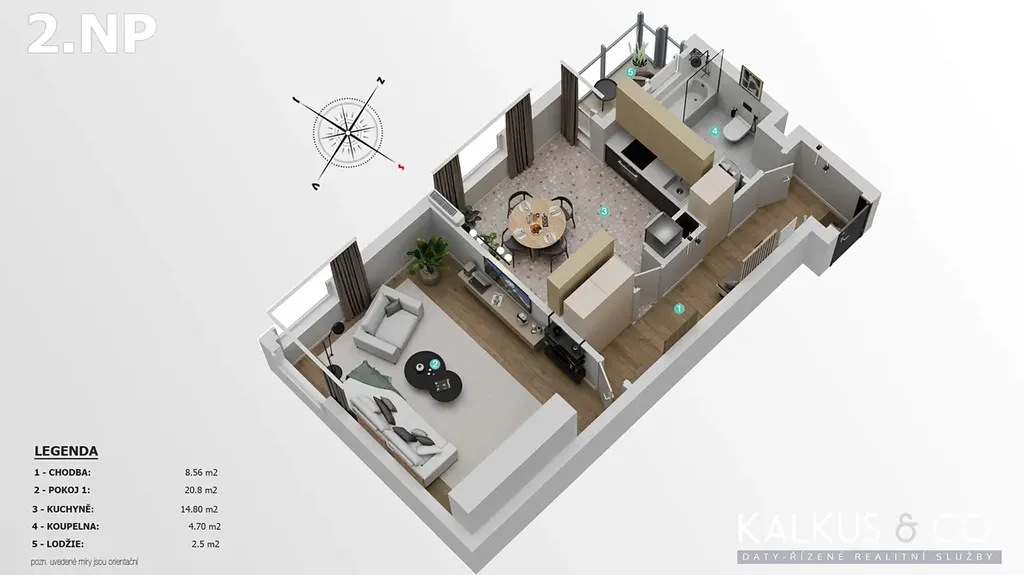 Byt prošel částečnou rekonstrukcí a je ve velmi dobrém stavu, vhodném k okamžitému užívání. Koupelna s novými obklady, dlažbou a vanou je společná s WC. V kuchyni (cca 14,8 m²) se nachází nová kuchyňská linka včetně spotřebičů. V obývacím pokoji s rohovým oknem (cca 20,8 m²) zůstává mimo jiné patrová postel z masivního dřeva, pod kterou je prostor například pro pracovnu.