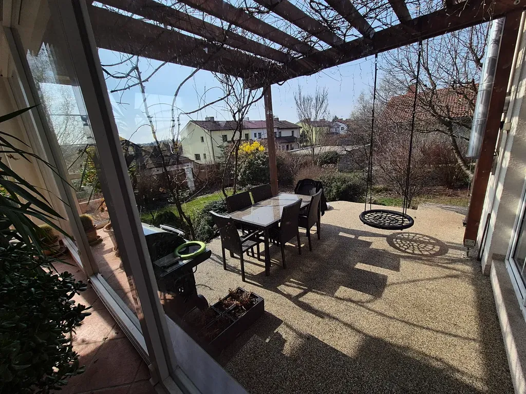 Pozemek o velikosti 715 m² je upravený tak, aby se na něm dobře žilo – okrasné dřeviny poskytují soukromí, bazén láká k letnímu osvěžení a terasa, navazující na zimní zahradu, je ideálním místem pro dlouhé večery s rodinou nebo přáteli.