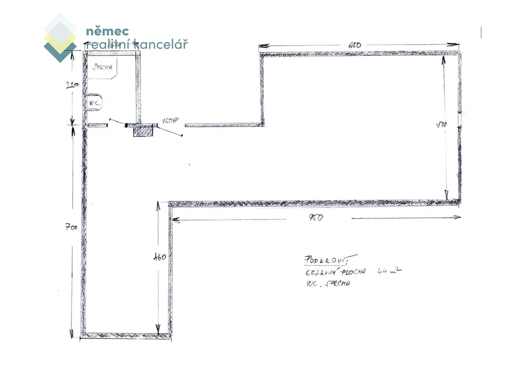 Dispozice - velký prostor oddělený do dvou částí, sociální zařízení se sprchou a WC.