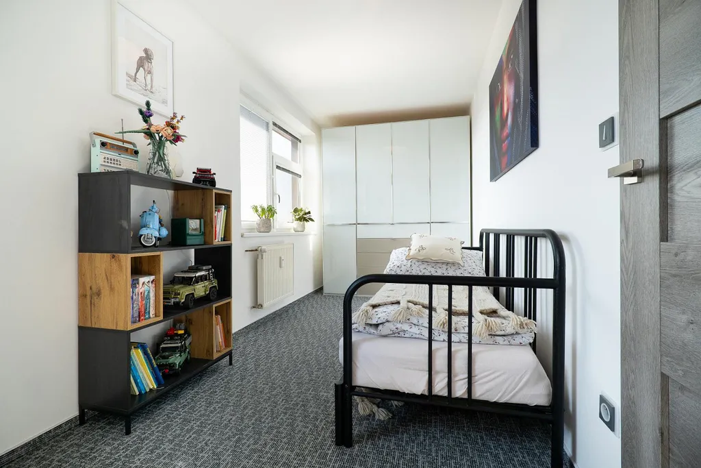Dominantou spodního podlaží je prostorný obývací pokoj propojený s kuchyňským koutem, který vytváří otevřený a světlý obytný prostor ideální pro každodenní život i setkávání s přáteli. Kuchyň je prakticky řešená a nabízí dostatek pracovního i úložného prostoru. Součástí tohoto patra je také vstupní hala. V horním podlaží se nachází dvě ložnice, koupelna s WC, samostatná šatna a chodba. Z jedné z ložnic je vstup na balkon, který nabízí příjemné místo pro relaxaci.