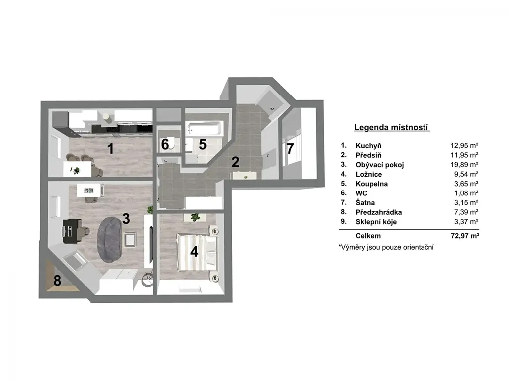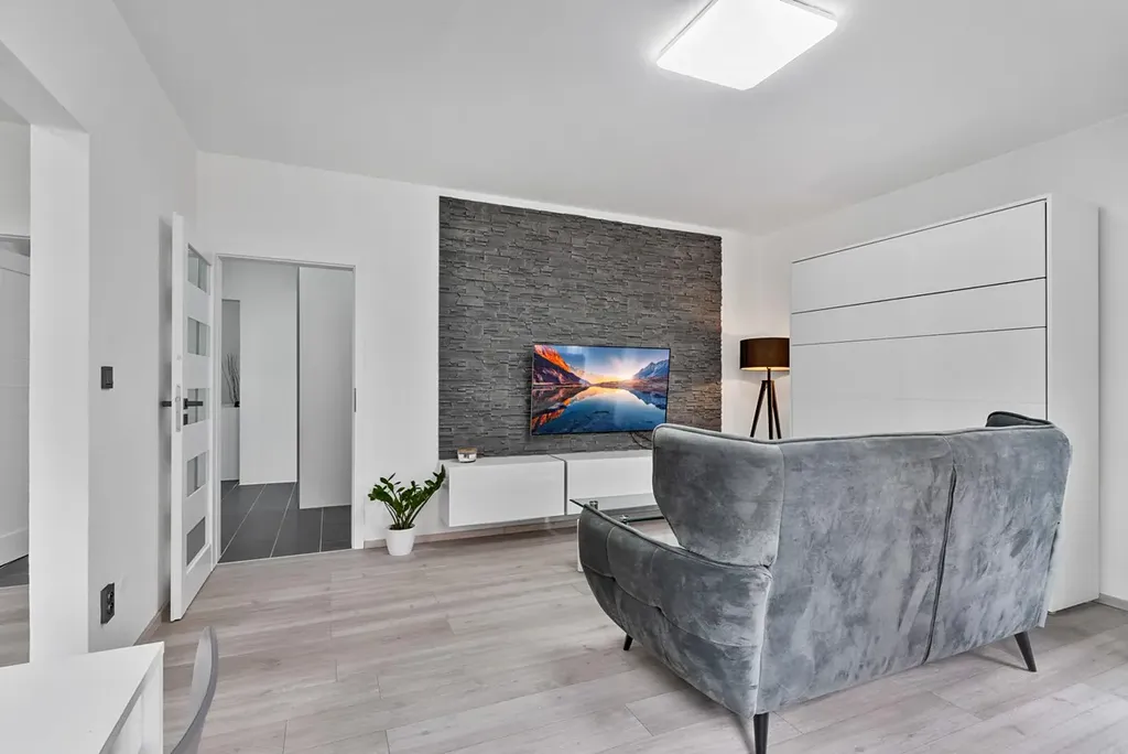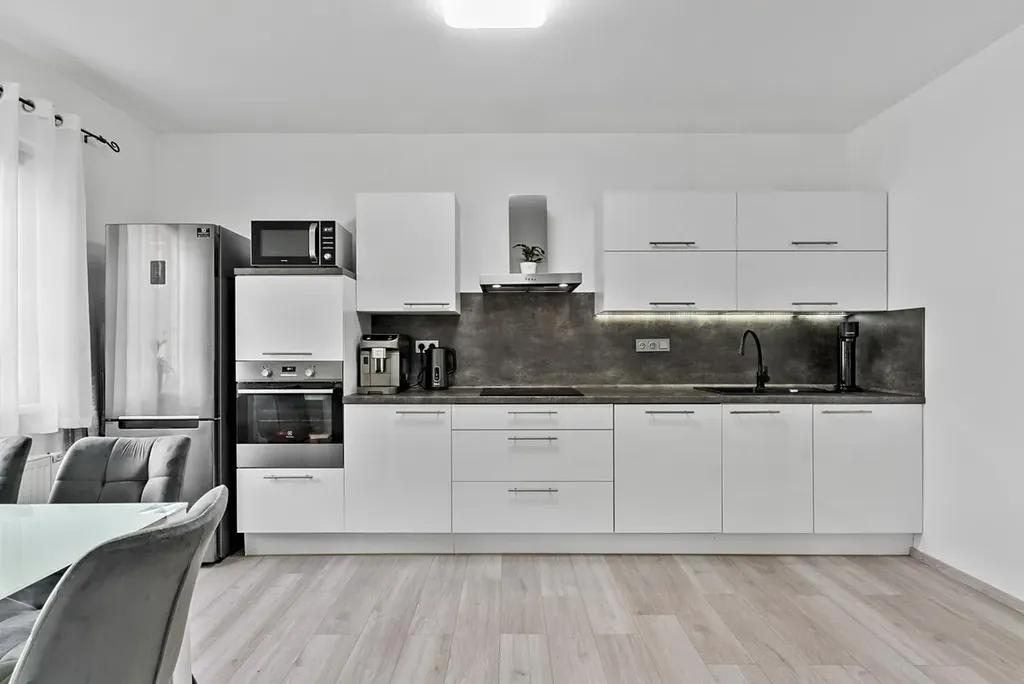 Celý byt působí velmi harmonicky, vkusně a moderně bez potřeby dalších investic. Většina vybavení může být součástí kupní ceny, takže se můžete téměř okamžitě nastěhovat a začít psát svůj nový příběh.