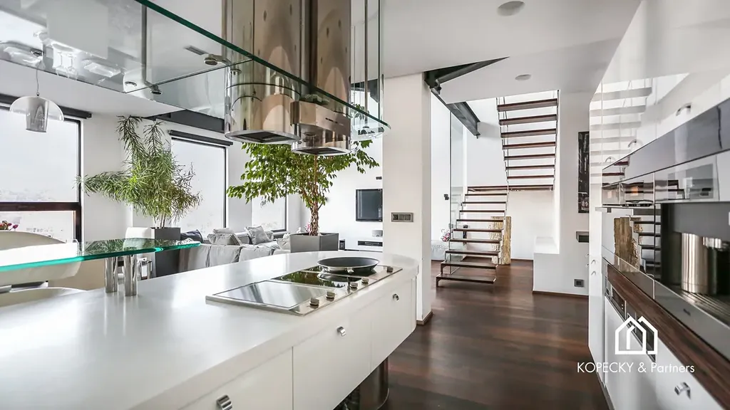 Hlavní obytný prostor vás uchvátí svou vzdušností a rozměry – dvojitá výška stropu vytváří dojem velkoleposti, zatímco velká okna poskytují dostatek přirozeného světla a dechberoucí výhledy na historické panorama Prahy. Kuchyň je vybavena špičkovými spotřebiči značky Miele a splňuje nejvyšší nároky na funkčnost a design. Pro maximální komfort je loft vybaven klimatizací a moderní rekuperační jednotkou, která se stará o neustálou výměnu a čerstvost vzduchu, což zaručuje optimální vnitřní prostředí po celý rok.
