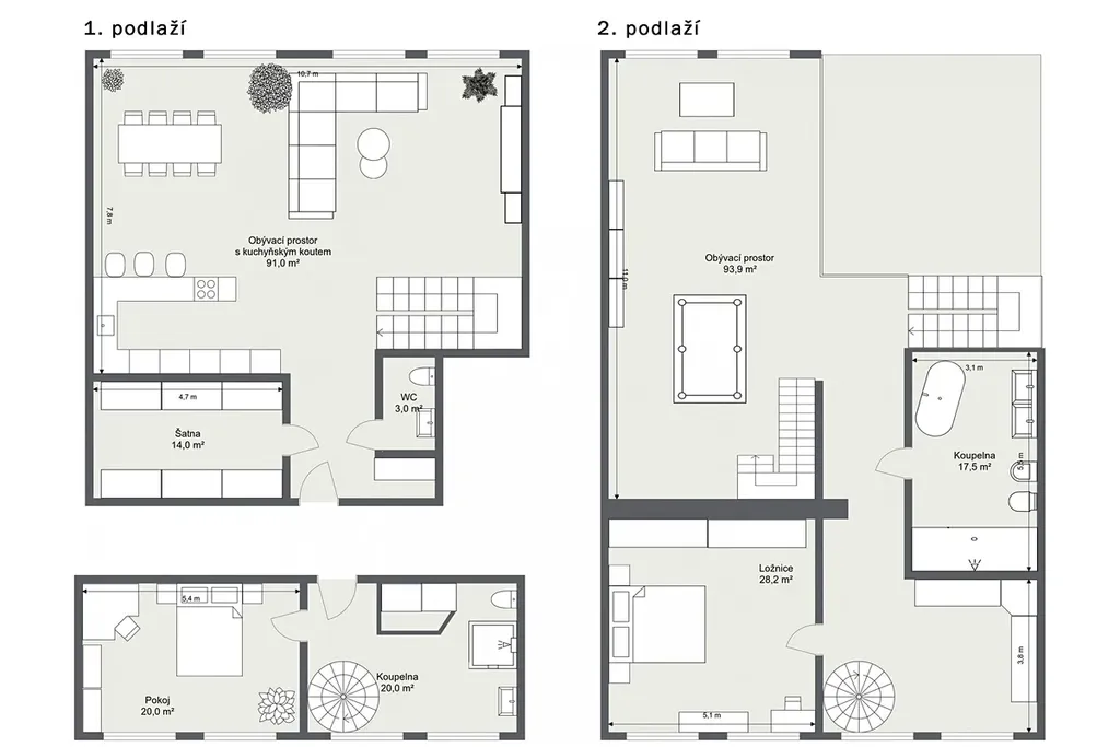 V horním patře najdete prostornou ložnici, která poskytuje klid a soukromí, a vedle ní se nachází otevřené atrium, které je ideálním místem pro domácí kancelář, čítárnu nebo odpočinkovou zónu. Z obou těchto prostor je přístup na impozantní střešní terasu o rozloze 140 m2, ideální pro relaxaci, večerní posezení s přáteli nebo nerušené chvíle pod širým nebem s panoramatickým výhledem na město.