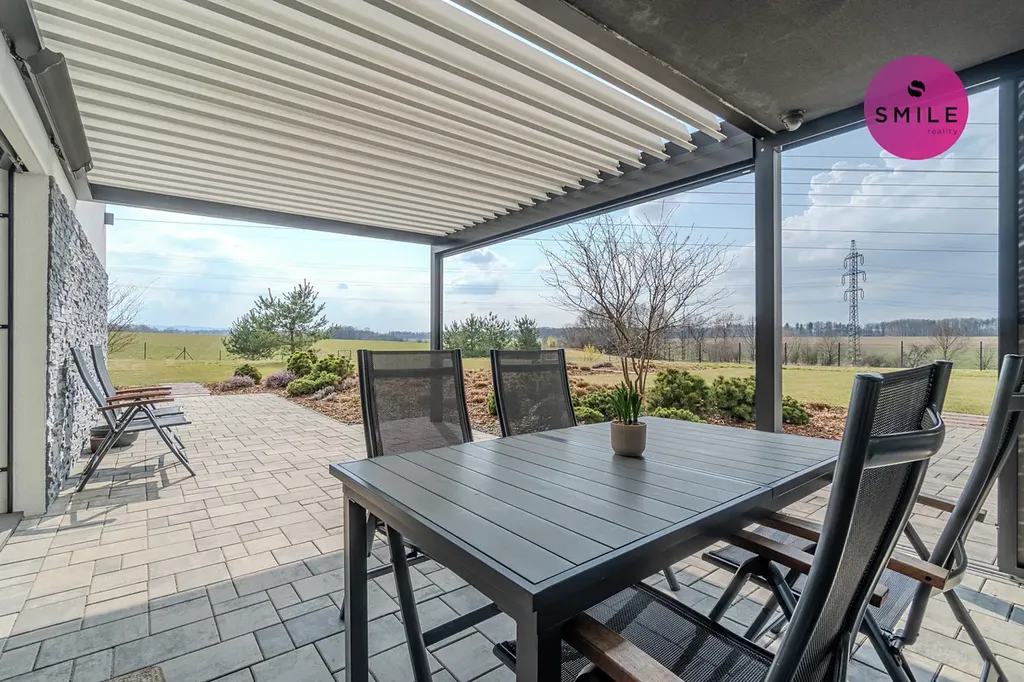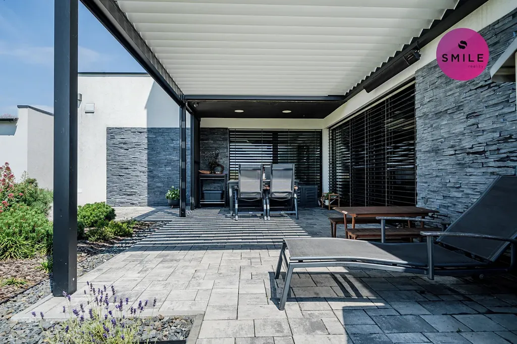 Pozemek je řešen s důrazem na pohodlí, soukromí i estetiku. Vstup na pozemek zajišťuje elektrická pojezdová brána, instalován elektronický zabezpečovací systém Jablotron, pohybová čidla a venkovní kamery. Pro chvíle odpočinku i setkávání s rodinou a přáteli je k dispozici elegantní bioklimatická pergola zn. Renson a pečlivě upravená zahrada realizována firmou Lampart & Mec. Nechybí vyvýšené záhony, odpočinková místa, prostor pro grilování či opékání, dětské pískoviště.