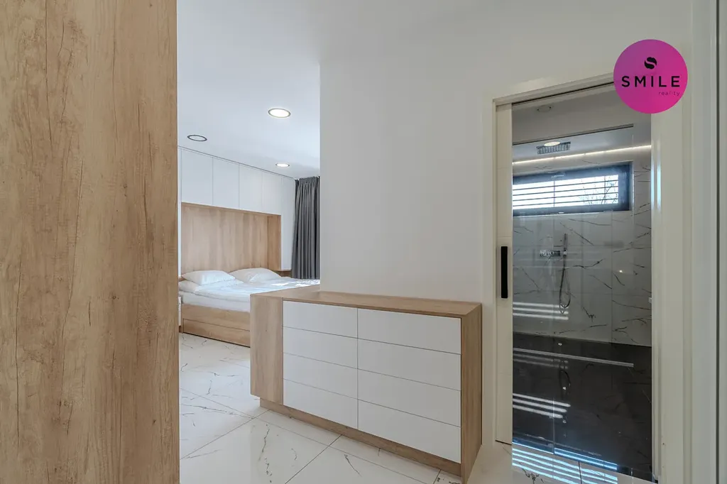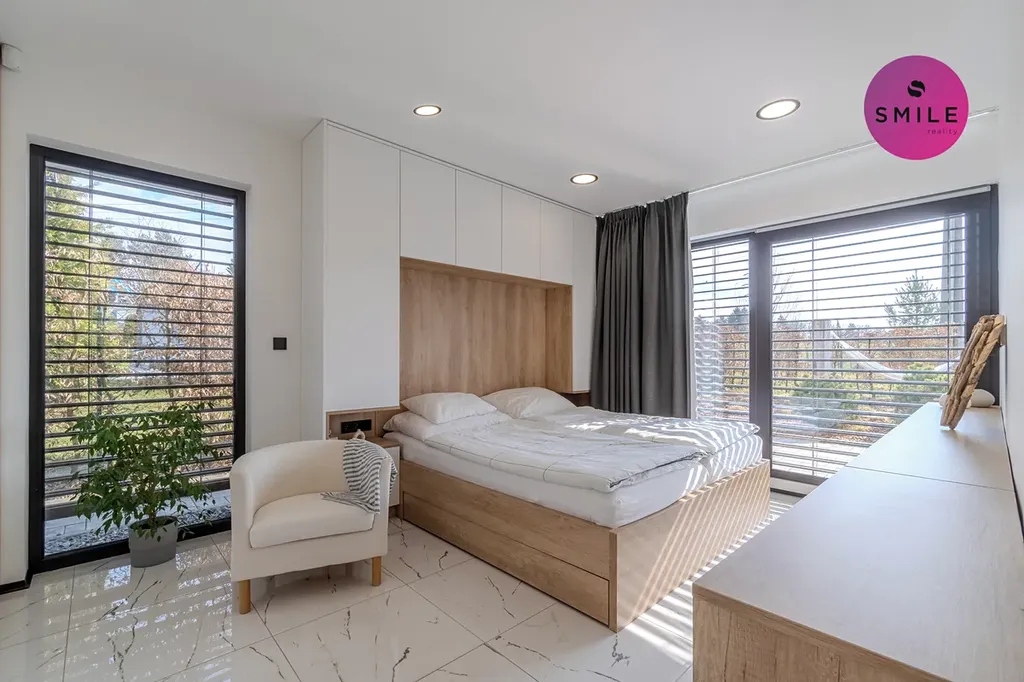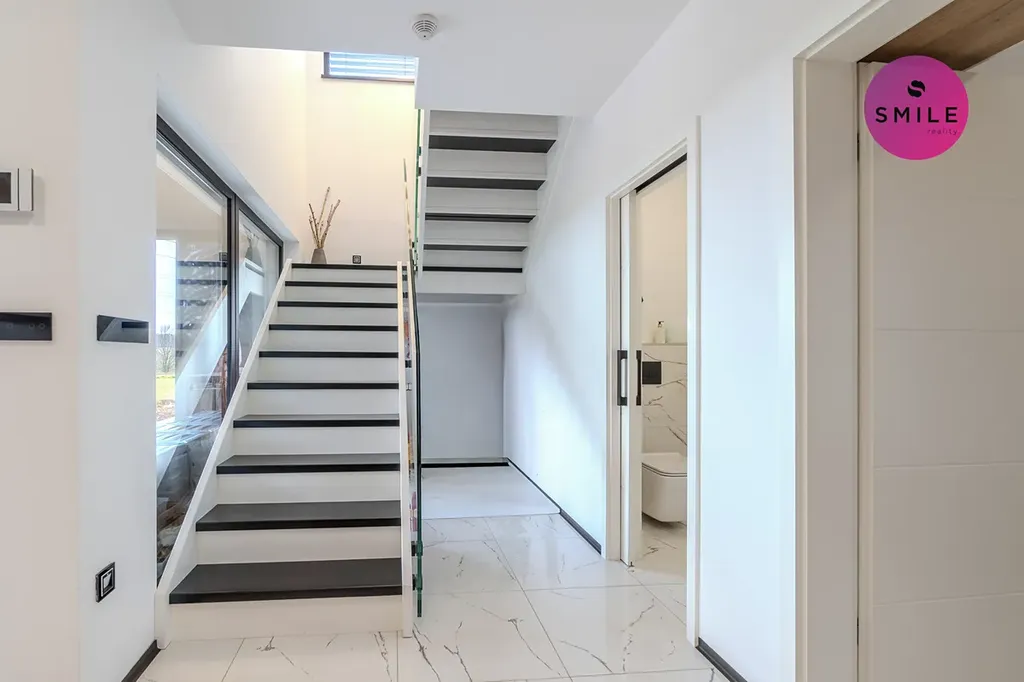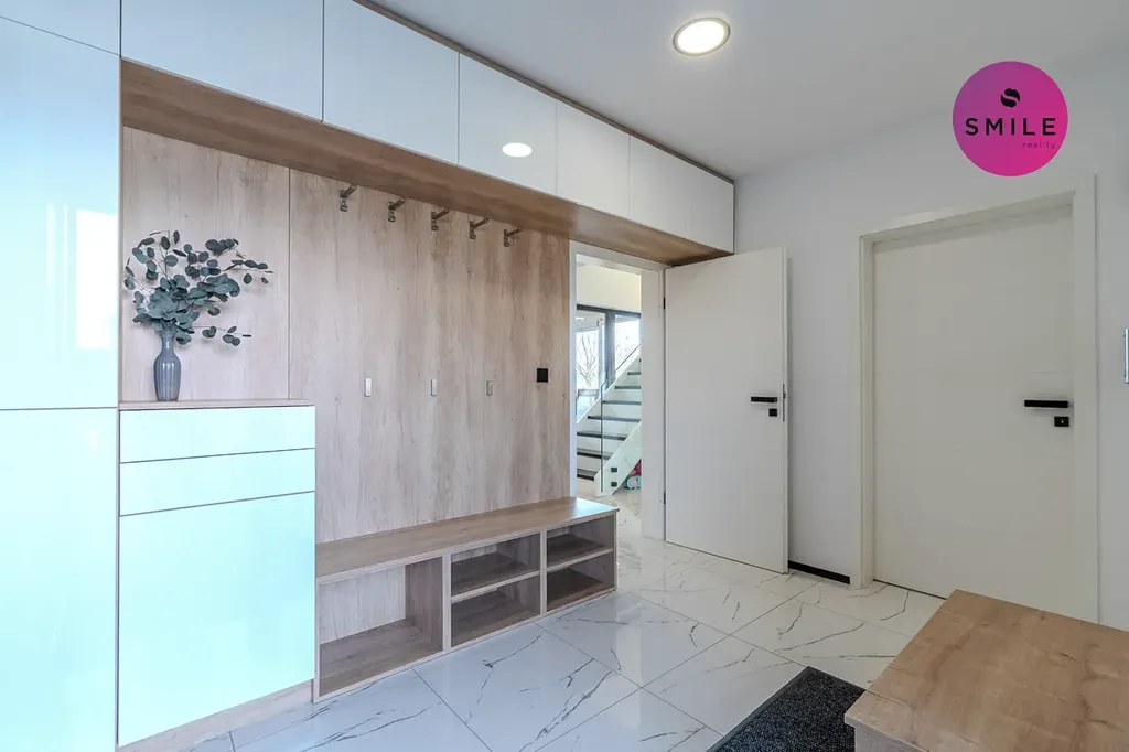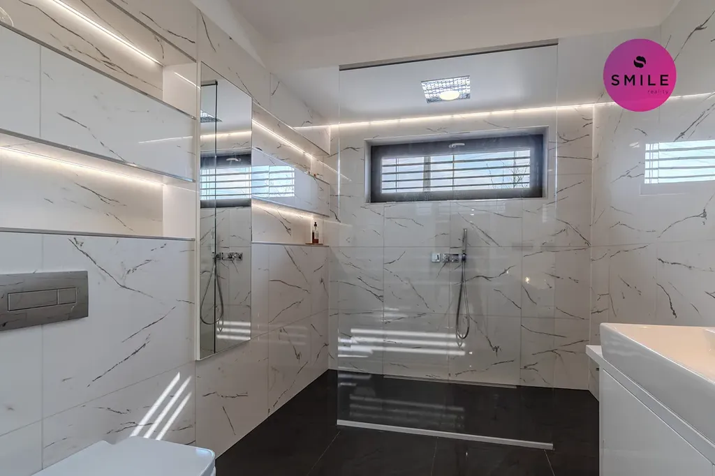 V interiéru nechybí prvky, které podtrhují celkový nadstandard domu – centrální vysavač Electrolux, okna s trojskly, sítě proti hmyzu, venkovní žaluzie či designové vypínače. Dům nabízí také praktické technické zázemí, dostatek úložných prostor a celkově velmi komfortní provoz pro každodenní rodinné fungování.