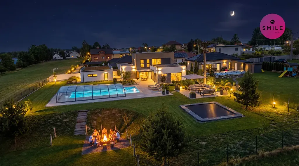 Dům byl kolaudován v roce 2017 a realizován renomovanou firmou Gansa. Nachází se na krásném, velkorysém pozemku o výměře 2 135 m², který poskytuje dostatek prostoru pro rodinný život, relaxaci i reprezentativní zázemí.