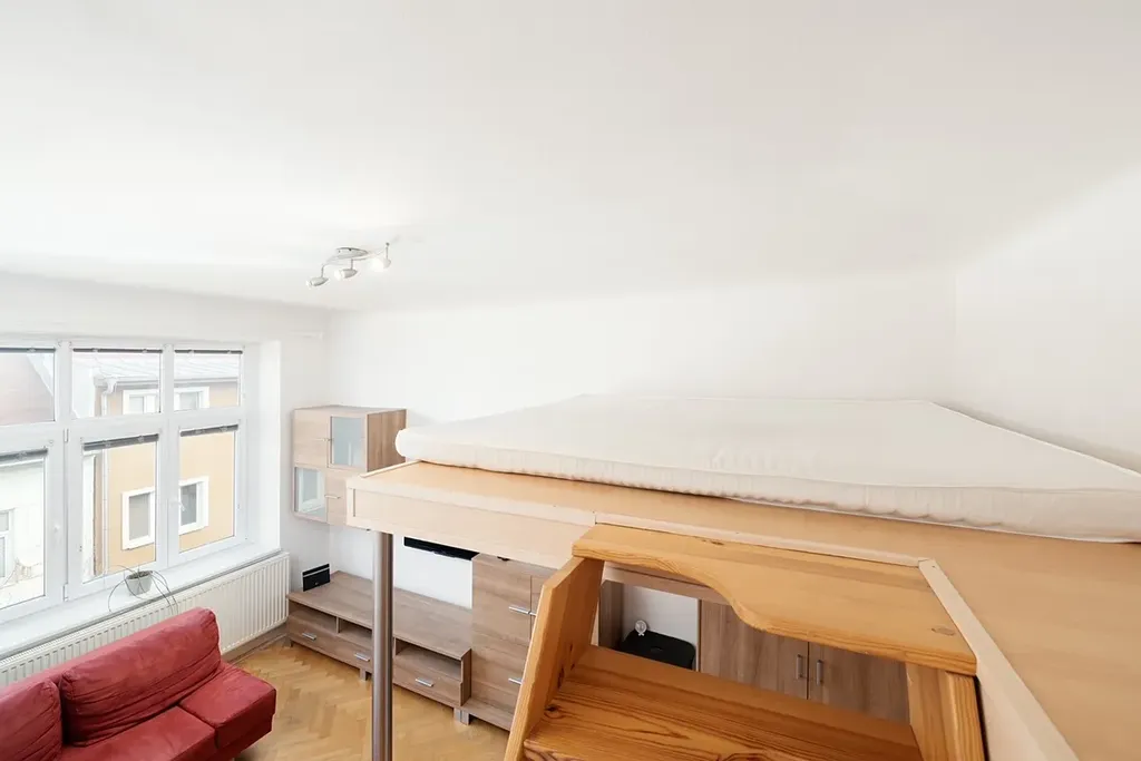 Ve výhradním zastoupení majitele nabízíme k pronájmu plně vybavený a zřízený byt o velikosti 1+1, jehož řešení, kdy je obývací pokoj rozšířen o "spací patro" čímž se rozšiřuje užitný prostor. Kuchyňký kout je samostatný. Součástí koupelny je nejen sprchovací vana se zástěnou, ale i toaleta. Byt se nachází v posledním patře, takže máte klid. Vytápění zjišťuje samostatný elektrický kotel včetně boileru.