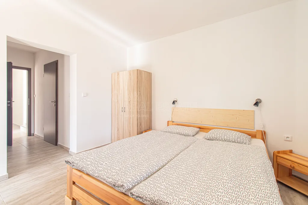 Apartmán č. 2 je útulnější jednotka s ložnicí a vlastní koupelnou se sprchovým koutem a WC, ideální pro páry nebo kratší pobyty.
