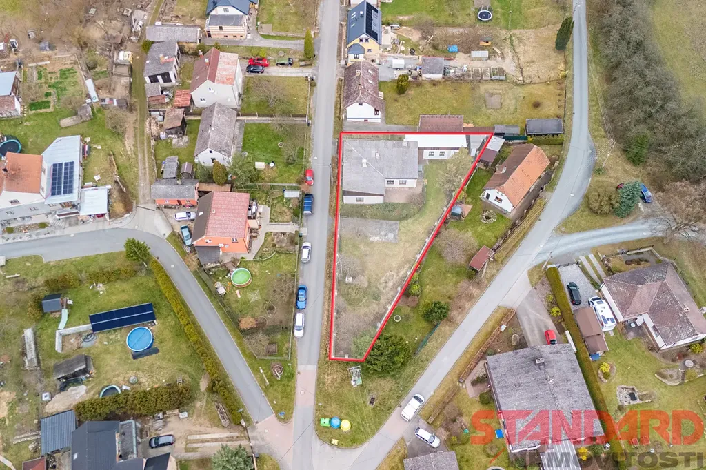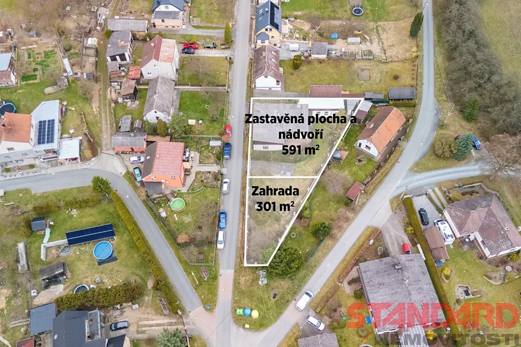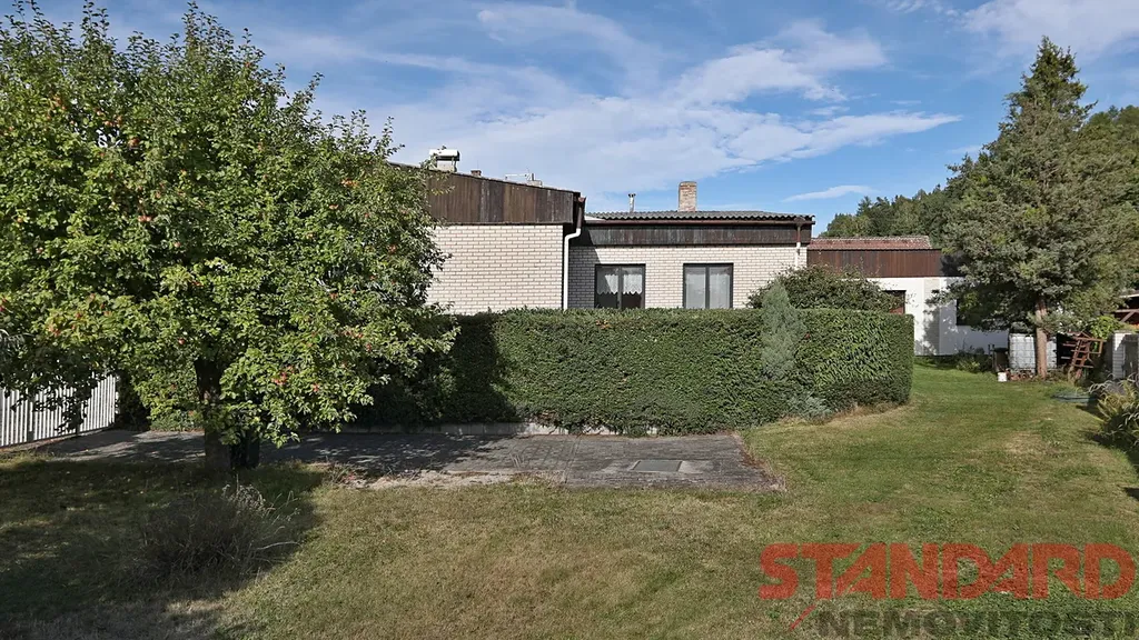 Pozemek má celkovou výměru 892 m² – zastavěná plocha a nádvoří 591 m², navazující udržovaná zahrada 301 m² se vzrostlými stromy a okrasnými dřevinami. K domu náleží samostatná garáž s montážní jámou, kolna a zahradní domek. V prostorném, částečně zastřešeném, průjezdu mezi domem a garáží lze pohodlně parkovat 2–3 osobní vozy, další vjezd a možnost parkování, je ze strany zahrady díky druhým vratům. Pozemek je kompletně oplocen, kolem domu a na terase je kvalitní zámková dlažba.