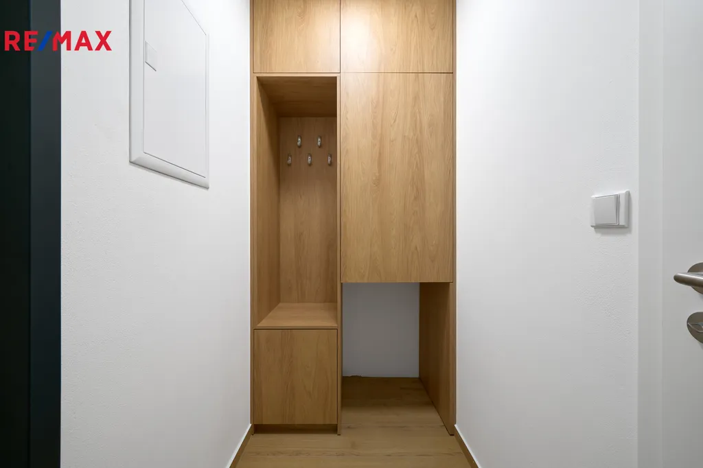 Dispozice bytu je prakticky řešená a nabízí vstupní chodbu se skříní, prostorný a světlý pokoj, kuchyňský kout, koupelnu s WC a sprchovým koutem. Součástí koupelny je také pračka, umyvadlová skříňka a zrcadlová skříňka. Kuchyňská linka je nová a vybavena elektrickou troubou, sklokeramickou varnou deskou, myčkou nádobí a volně stojící lednicí. V chodbě bytu je umístěná skříň.