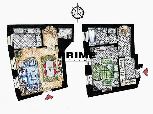 Byt je orientován do klidné boční ulice. V bytě jsou gotické klenby. Byt má dva vstupy, jeden z každého podlaží. V dolní části bytu je: vstupní předsíň se šatnou, ložnice (15m2), koupelna (vana, sprchový kout, umyvadlo, toaleta a bidet) a točité schodiště vedoucí z předsíně do horního podlaží, ve kterém je: obývací pokoj (35m2) s jídelní částí, plně vybavená kuchyň se spotřebiči (plynová varná deska, trouba, lednice, mrazák a myčka + nádobí) a komora. Na podlaze jsou parkety a dlažba s orientálními koberci. K dispozici je TV, satelit a pračka se sušičkou.
