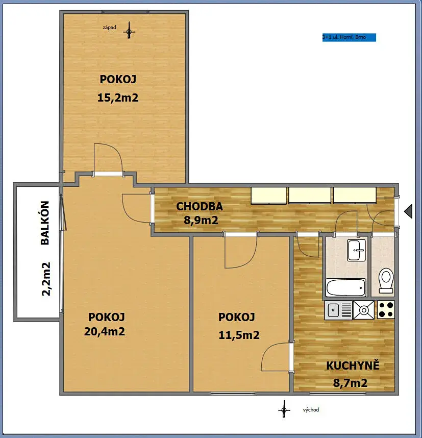 kuchyň 8,7 m2 a pokoj 11,5 m2 směrem k východu, pokoj 20,4 m2 s balkonem 2,2 m2, pokoj 15,2 m2 směrem k západu, chodba 8,9 m2, samostatná koupelna s vanou 2,3 m2, WC 0,8 m2.