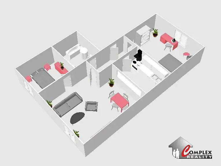 Byt se skládá z předsíně - 4,25 m2, koupelny s vanou + toaleta - 5,55 m2, 2 neprůchozích místností ( pokoj, ložnice ) - 11,70 m2, 12,10 m2 a kuchyně s obývací částí - 19,20 m2.