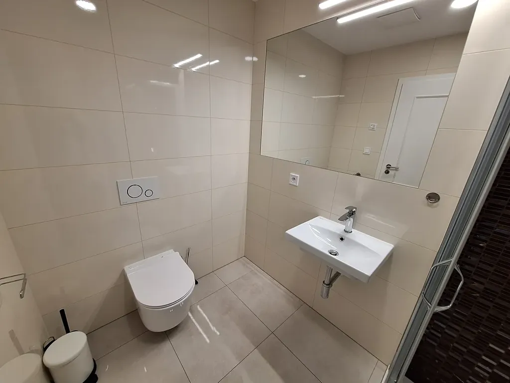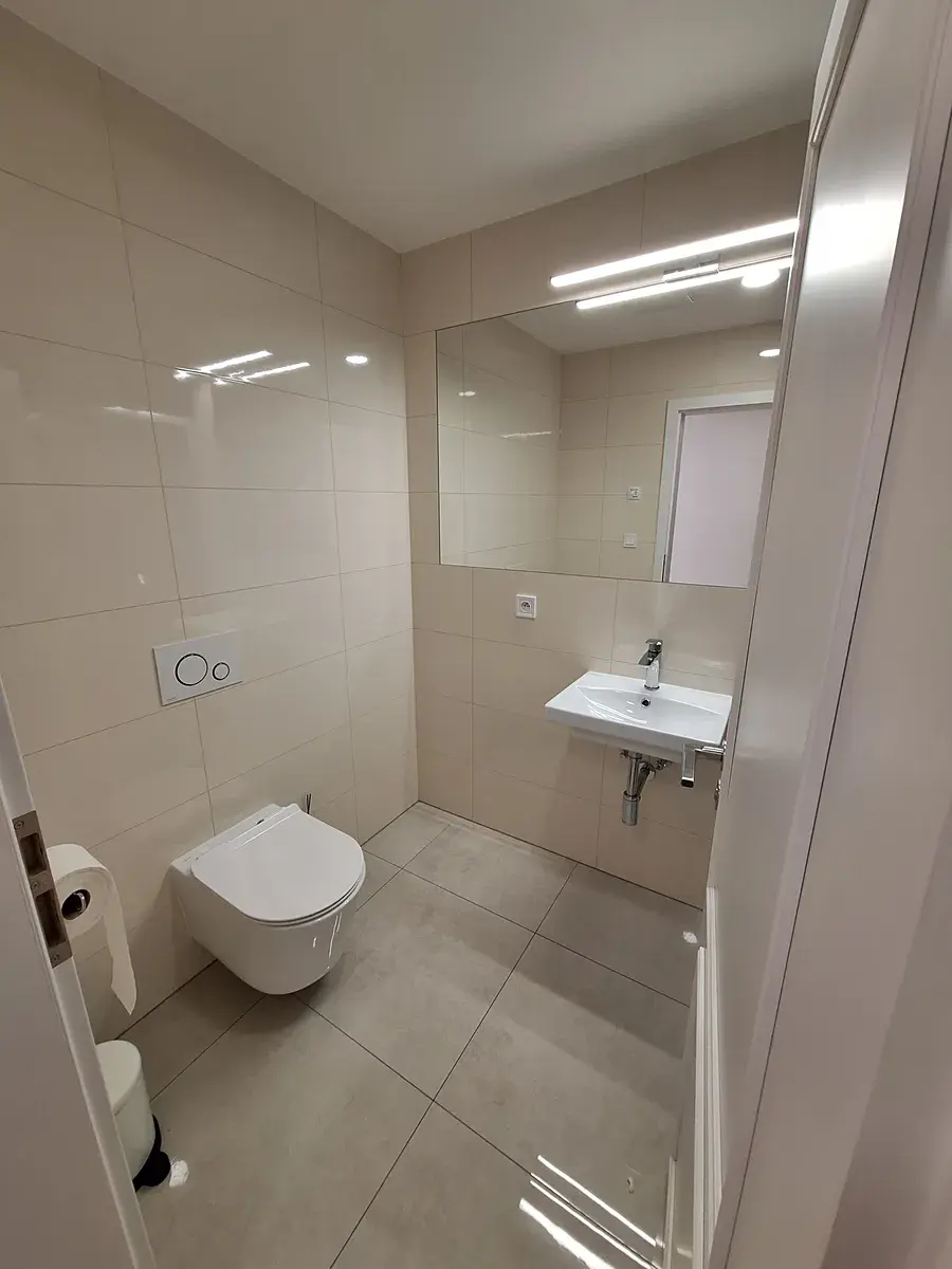 Byt ve 2. patře má vstupní chodbu, koupelnu se sprchovým koutem a WC, pračka se sušičkou. Pokoj s kuchyňskou linku a výstupem na balkón. Dále druhý neprůchozí pokoj, také s přístupem na lodžii. Pěkné moderní bydlení v příjemné prémiové části Prahy.