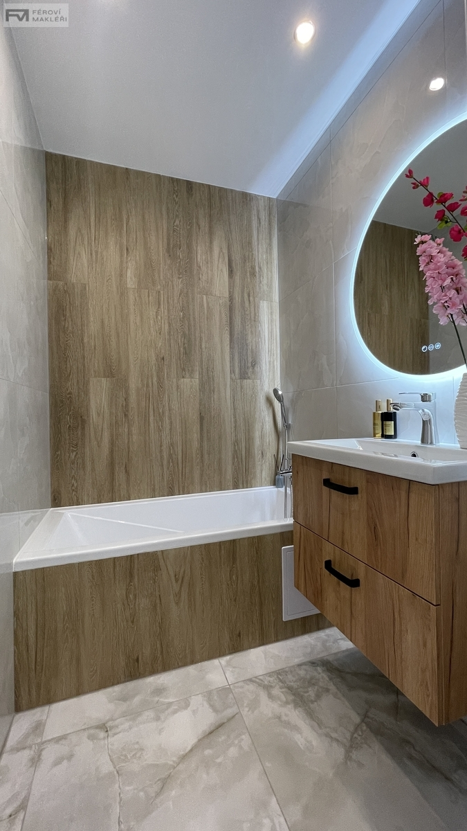 Elegantní zvětšená koupelna s velkoformátovým obkladem a vanou, wc samostatné. Ložnice orientovaná na východ. V bytě je položena kombinace moderní italské dlažby a plovoucí podlahy. Byt se nachází v 3. patře a má klidné sousedy.