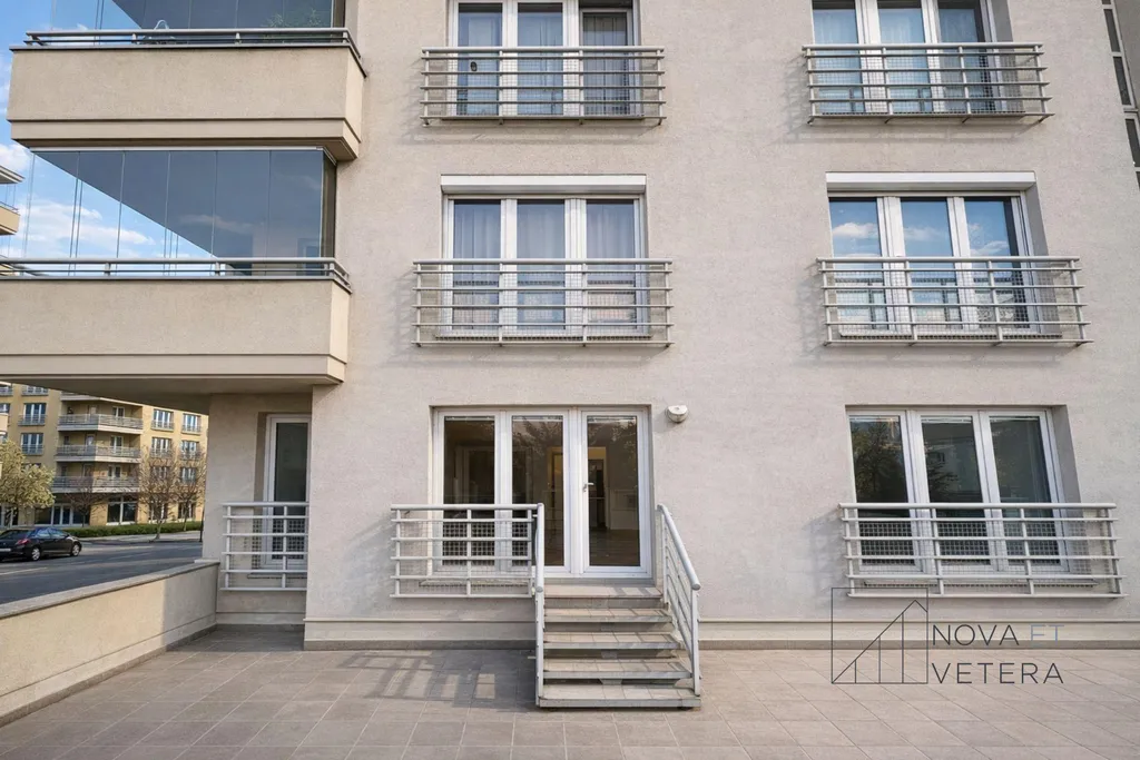 Dispozice bytu nabízí prostorný obývací pokoj s kuchyňským koutem a přímým vstupem na západně orientovanou terasu, která představuje výjimečný benefit této nemovitosti. Terasa poskytuje dostatek prostoru pro relaxaci i vlastní realizaci – nabízí se například vybudování venkovního posezení, grilu či privátní vířivky dle představ nového majitele. Součástí je také vyvýšený záhon se vzrostlými cedry, který dodává prostoru zeleň a příjemnou atmosféru soukromí.