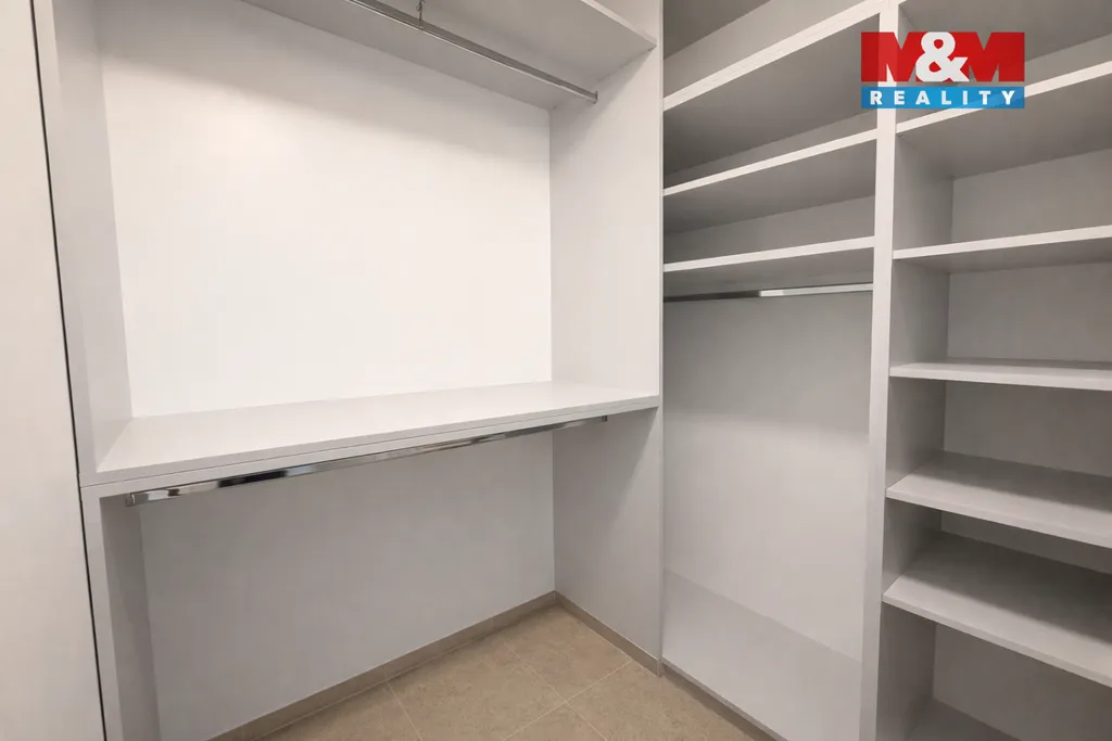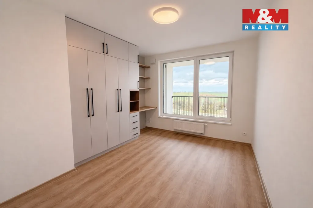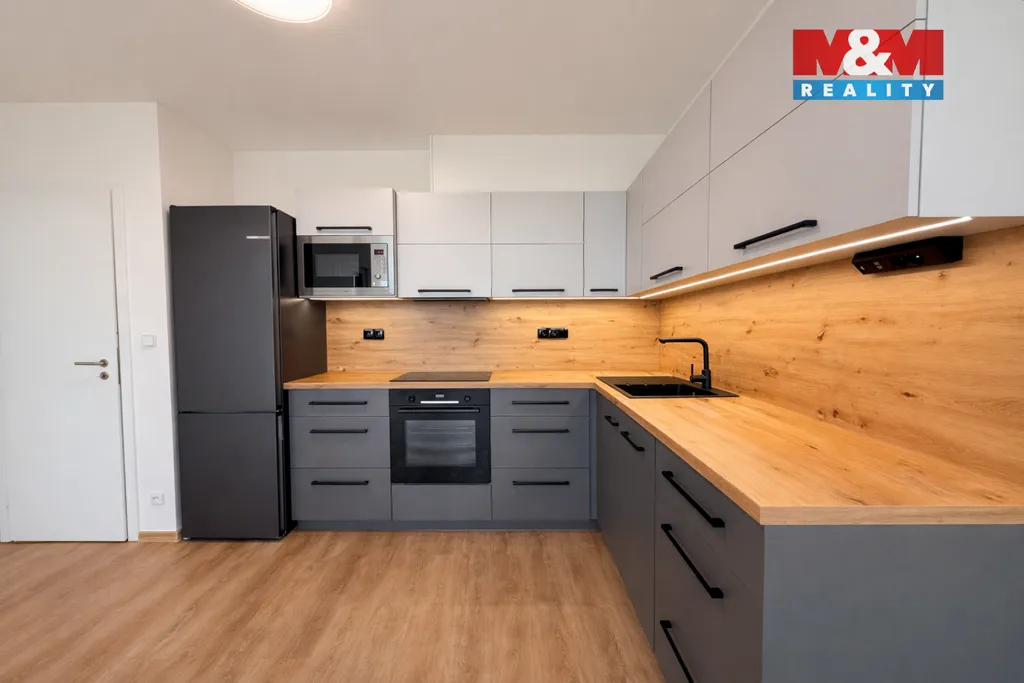 Obývací pokoj s kuchyňským koutem tvoří přirozené centrum bytu. Kuchyňská linka na míru je plně vybavena spotřebiči (lednice, trouba, indukční deska, myčka, mikrovlnná trouba), takže vaření i každodenní fungování je maximálně pohodlné. Ložnice nabízí klidné zázemí s vestavěnými skříněmi i pracovním koutem. Nechybí ani praktická komora a chytré úložné prostory v předsíni.