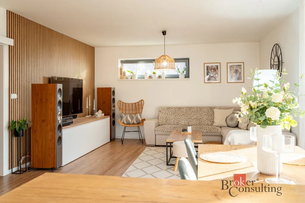 Interiér působí moderním a vzdušným dojmem a zůstává částečně vybavený, což novým majitelům usnadní nastěhování.