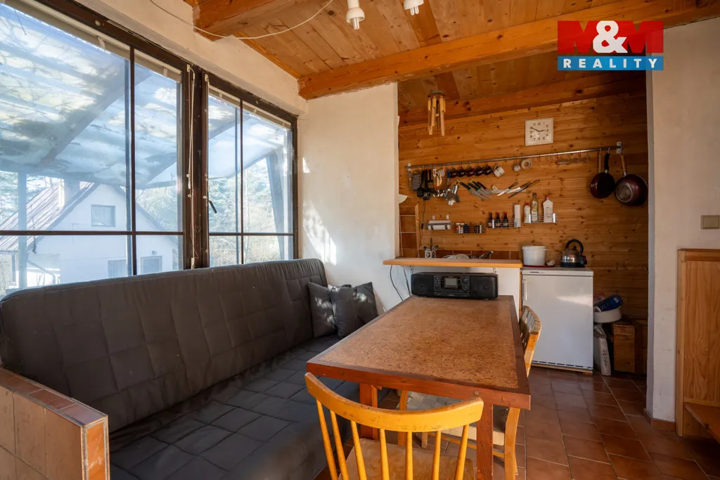 Samotná chata má 44 m² vnitřní plochy, je ve velmi dobrém technickém stavu, a ihned připravena k užívání. K tomu navíc zastřešená terasa o ploše 10 m² – ideální pro posezení s výhledem do zeleně. Velkým bonusem je sklep/dílna, který nabízí množství úložného prostoru a zároveň může sloužit jako zázemí pro kutily.