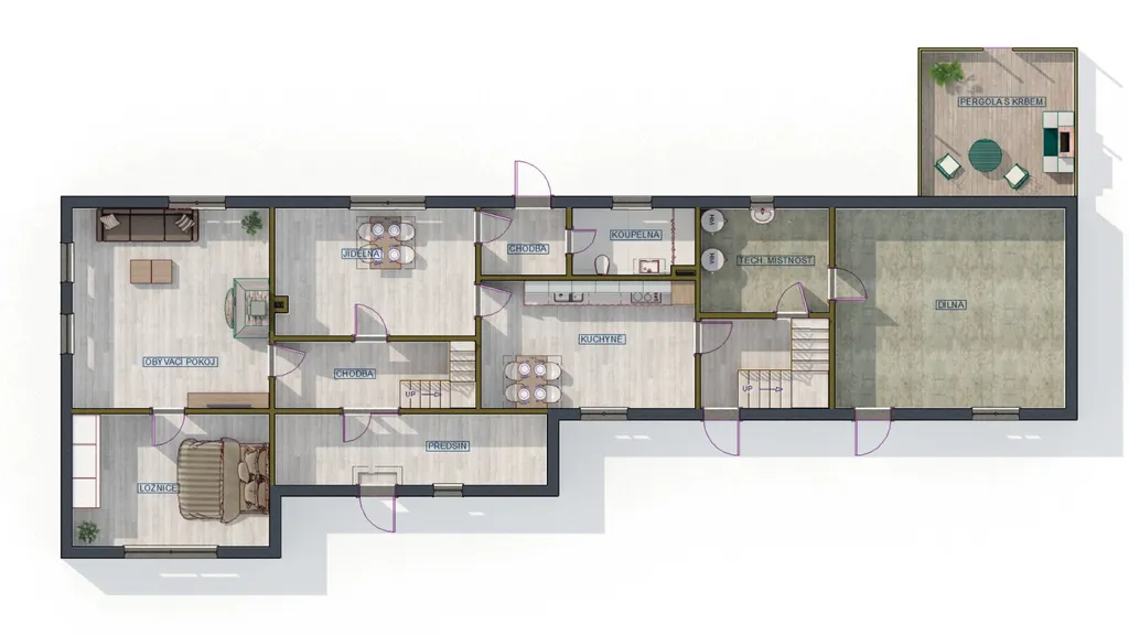 Do domu se vstupuje z uzavřeného dvora do předsíně, odkud pokračujete dále chodbou. Z chodby vede dřevěné schodiště do obytného podkroví. V přízemí se nachází kuchyně, samostatná jídelna, obývací pokoj, ložnice, koupelna s toaletou a druhý vstup, který vede přímo na zahradu.
