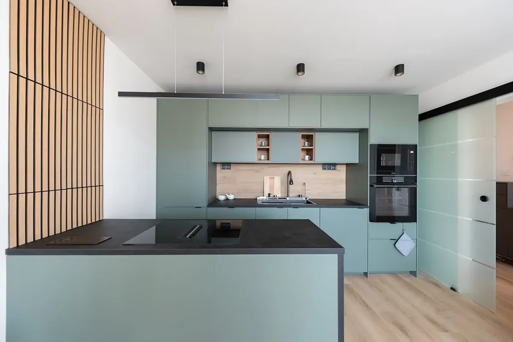 Vnitřní uspořádání - vstupní chodba (2,9m2) s úložnými prostory, samostatná neprůchozí ložnice (10,5m2) s velkou vestavěnou skříní, světlý obývací pokoj (15,6m2) napojený na kuchyňský kout, kde je k dispozici zánovní kuchyňská linka, která poskytuje dostatek pracovní plochy, úložných prostor a je plně vybavena vestavnými spotřebiči (pračka se sušičkou, myčka, lednice s mrazákem, horkovzdušná trouba, mikrovlnná trouba, sklokeramická deska). Moderní koupelna (2,9m2) v nadčasovém designu je vybavena dostatečně prostorným sprchovým koutem a wc.