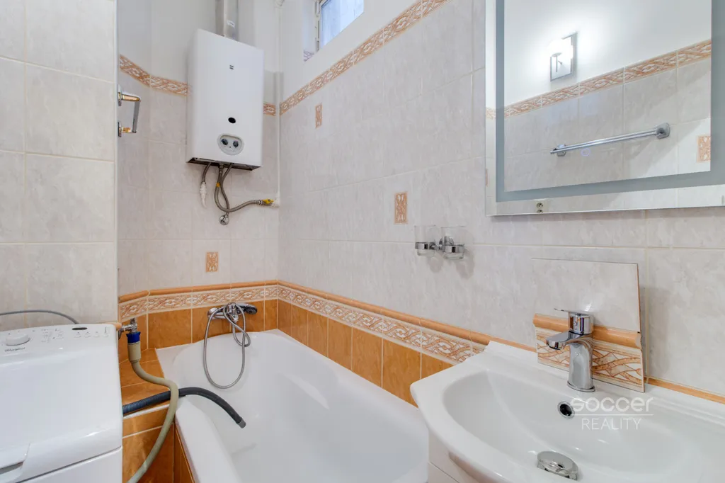 V bytě se nachází také nábytek – postel, skříně, TV a TV stěna. Koupelna je s vanou a pračkou. Topení plynové WAW.