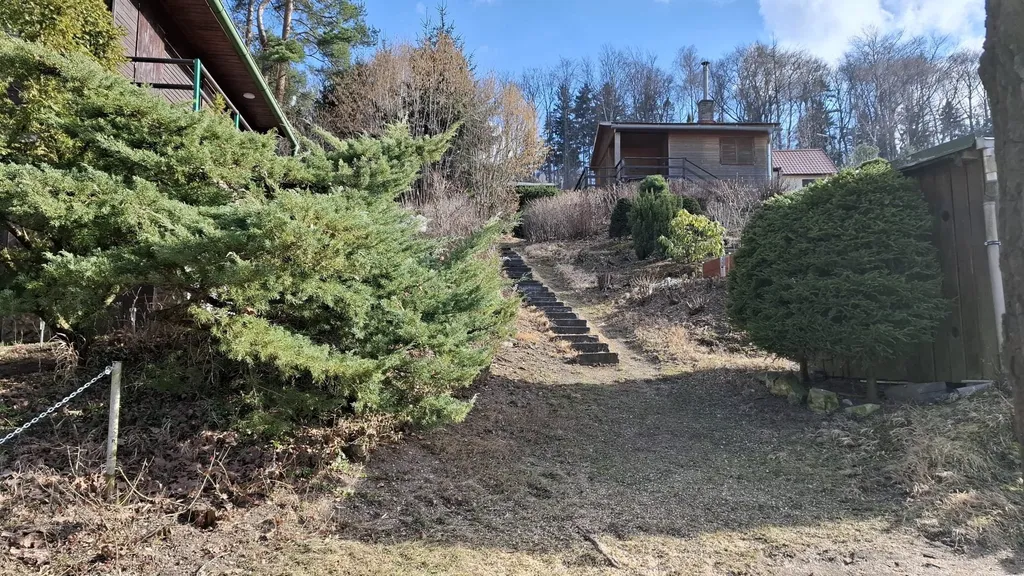 Chata - kuchyň se zádveřím, 1 pokoj (fotografie budou dodány). Součástí je uzamykatelný prostor na uskladnění dřeva, kde by bylo možné umístit chemické WC, vstup z venku chaty.