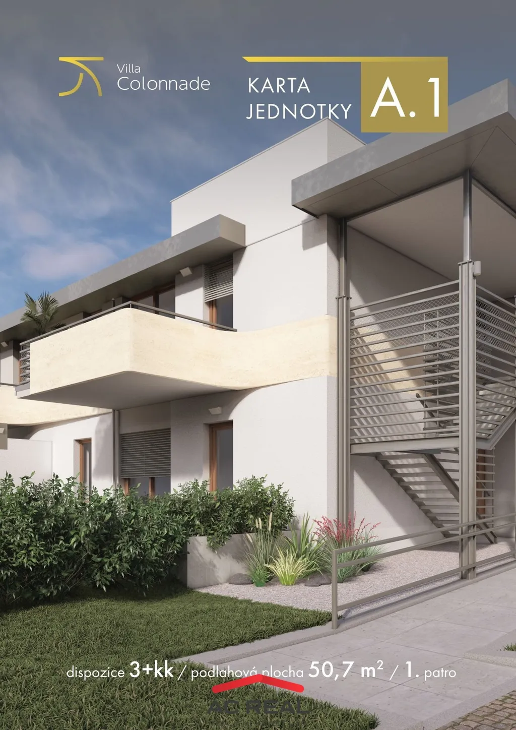 Představujeme Vám jedinečnou příležitost stát se majitelem apartmánu v prestižním projektu Villa Colonnade, který v sobě snoubí moderní architekturu, nadčasovou eleganci a maximální pohodlí. Apartmán o dispozici 3+kk 50,7 m² je situován v 1. nadzemním podlaží a okouzlí Vás rozlehlou terasou 29 m² a předzahrádkou 50 m².