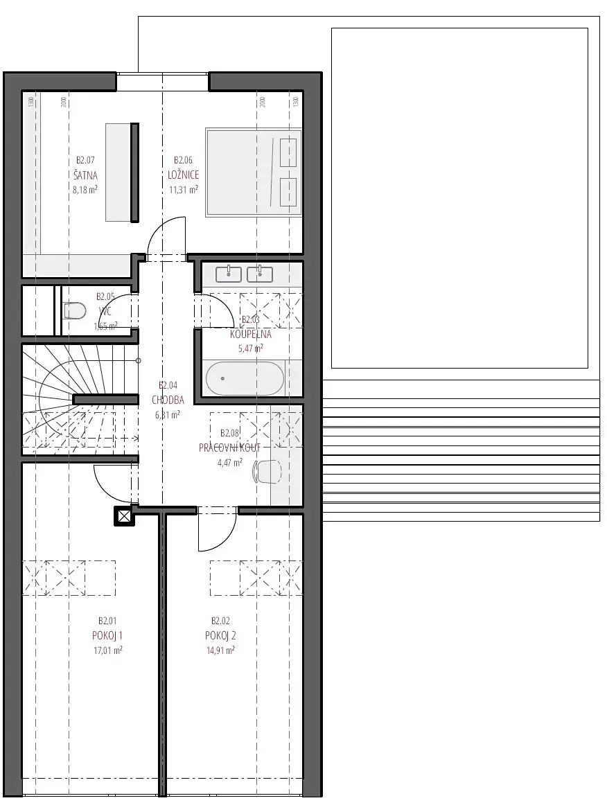 Exteriér domu je dán projektem (tvar, materiály, okna), vnitřní dispozice a standard interiéru jsou na volbě kupujícího. Cílem je zachování kvalitního a klidného charakteru lokality.