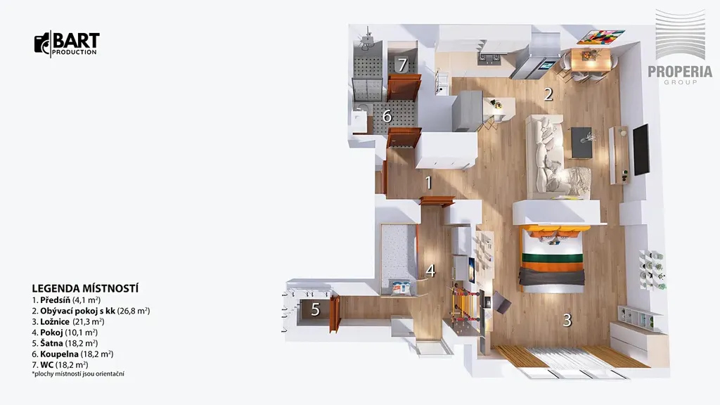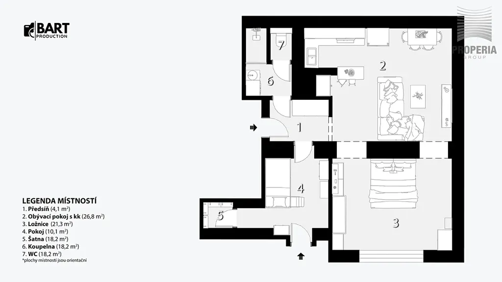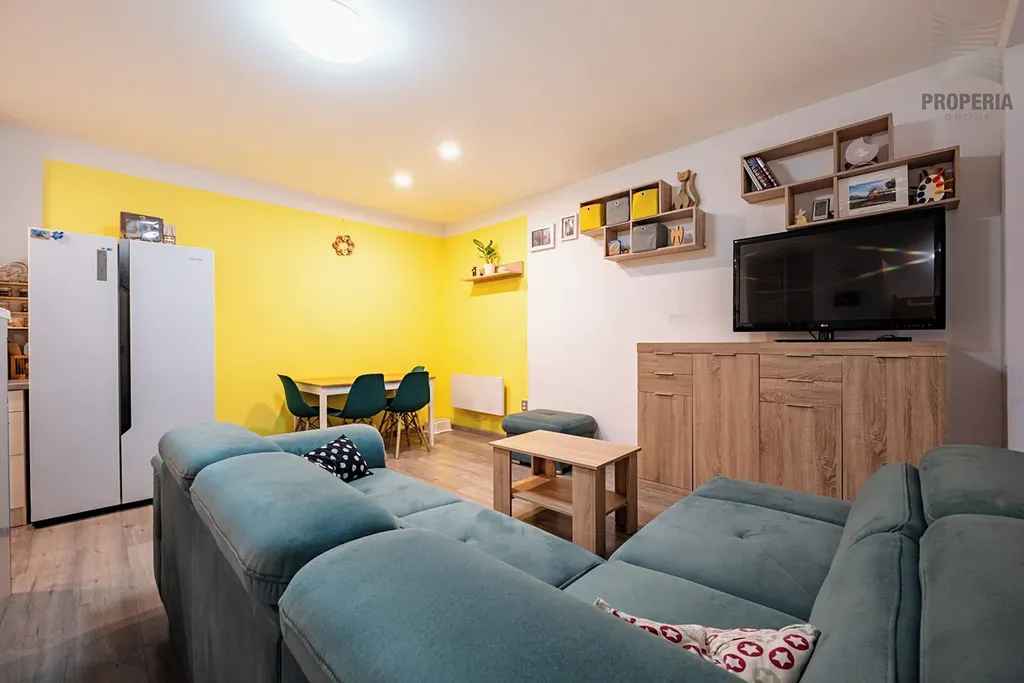 Byt zaujme především vzdušným obývacím prostorem s kuchyňským koutem, který tvoří přirozené centrum domova. Dále zde najdete dvě samostatné místnosti – ideální jako ložnice a dětský pokoj či pracovna. Dispozice je velmi funkční a vhodná jak pro rodinné bydlení, tak i jako investice.